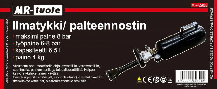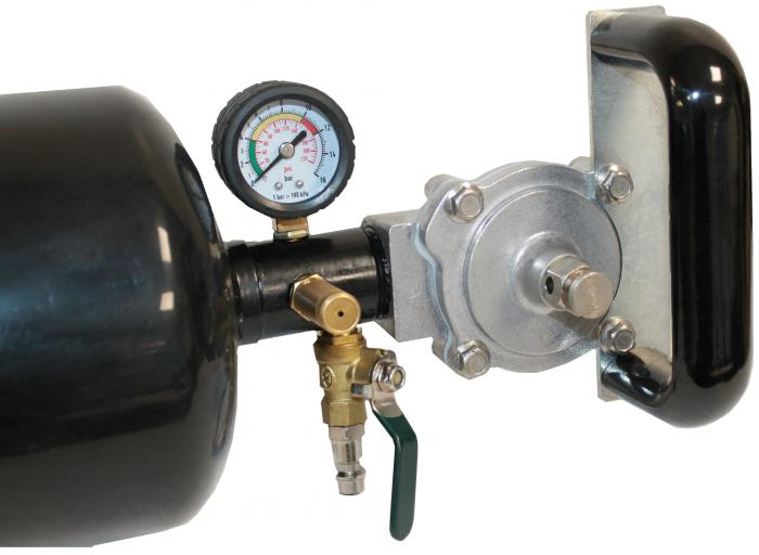 suuttimella, painemittarilla ja tulopalloventtiilillä.